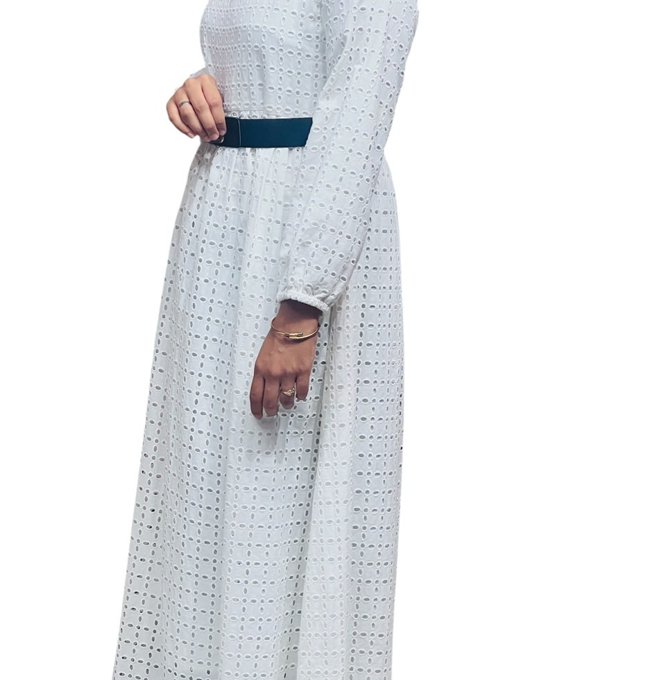 OVERALLIMPRESSION: THE DRESS LOOKS ELEGENT AND SUITABLE FOR CASUAL OCCATIONS.IT FEATURES LONG SLEEVES AND A ROUND NECKLINE.