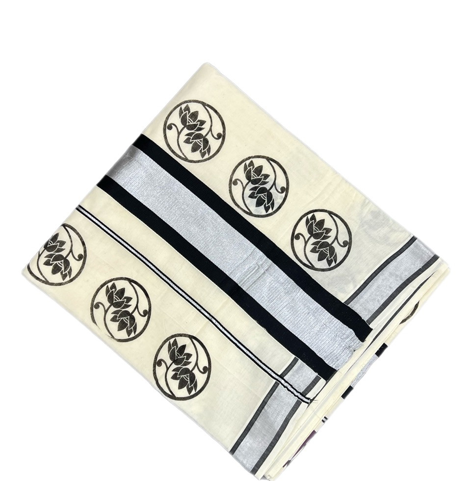 THIS IS A KERALA KASAVU SAREE WITH A MODERN PRINTED DESIGN.OCCASION: ONAM VISHU,TEMPLE VISITS,CULTURAL FUNCTIONS.